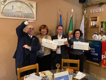 An interesting evening, well attended by AIRC Club Members and Members from the Loule and Vilamoura Rotary Clubs.Pictured above is the DG, Jorge Lucas Coelho, receiving from the Presidents of the Clubs, cheques for the Rotary International Eliminate Polio Campaign.